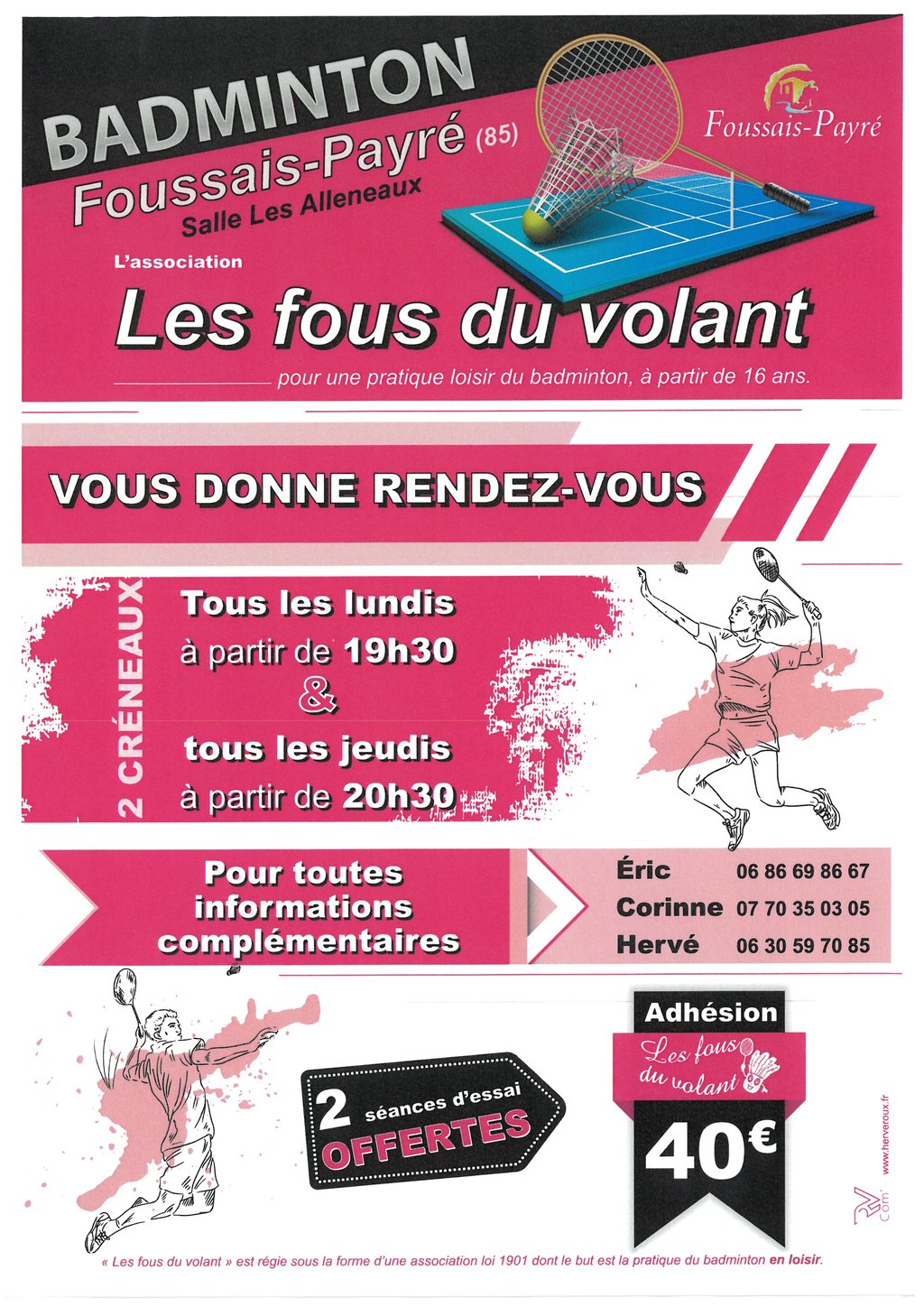 Depuis 12 ans, le club de badminton, Les Fous du Volant, fait vibrer la salle omnisports Les Alleneaux de Foussais-Payré. Avec une trentaine d’adhérents, le club se distingue par son ambiance chaleureuse et son esprit de camaraderie. Ici, le plaisir de jouer passe avant tout !