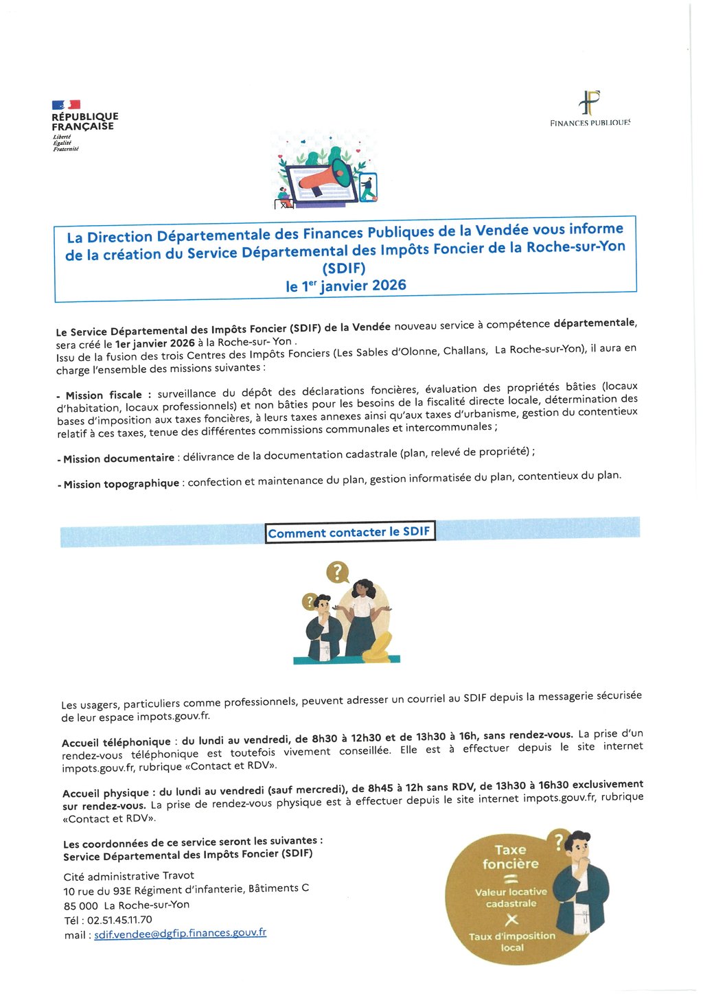 À compter du 1er janvier 2026, la Direction Départementale des Finances Publiques de la Vendée vous informe de la création du Service Départemental des Impôts Foncier (SDIF) à la Roche-sur-Yon.