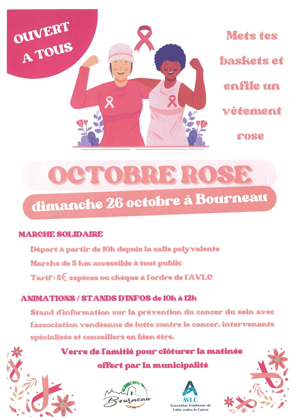 Dans le cadre du mois Octobre Rose, mois dédié à la sensibilisation de la lutte contre le cancer du sein, une marche est organisée au profit de la lutte contre le cancer le dimanche 26 octobre 2025 à Bourneau à partir de 10h depuis la salle polyvalente.