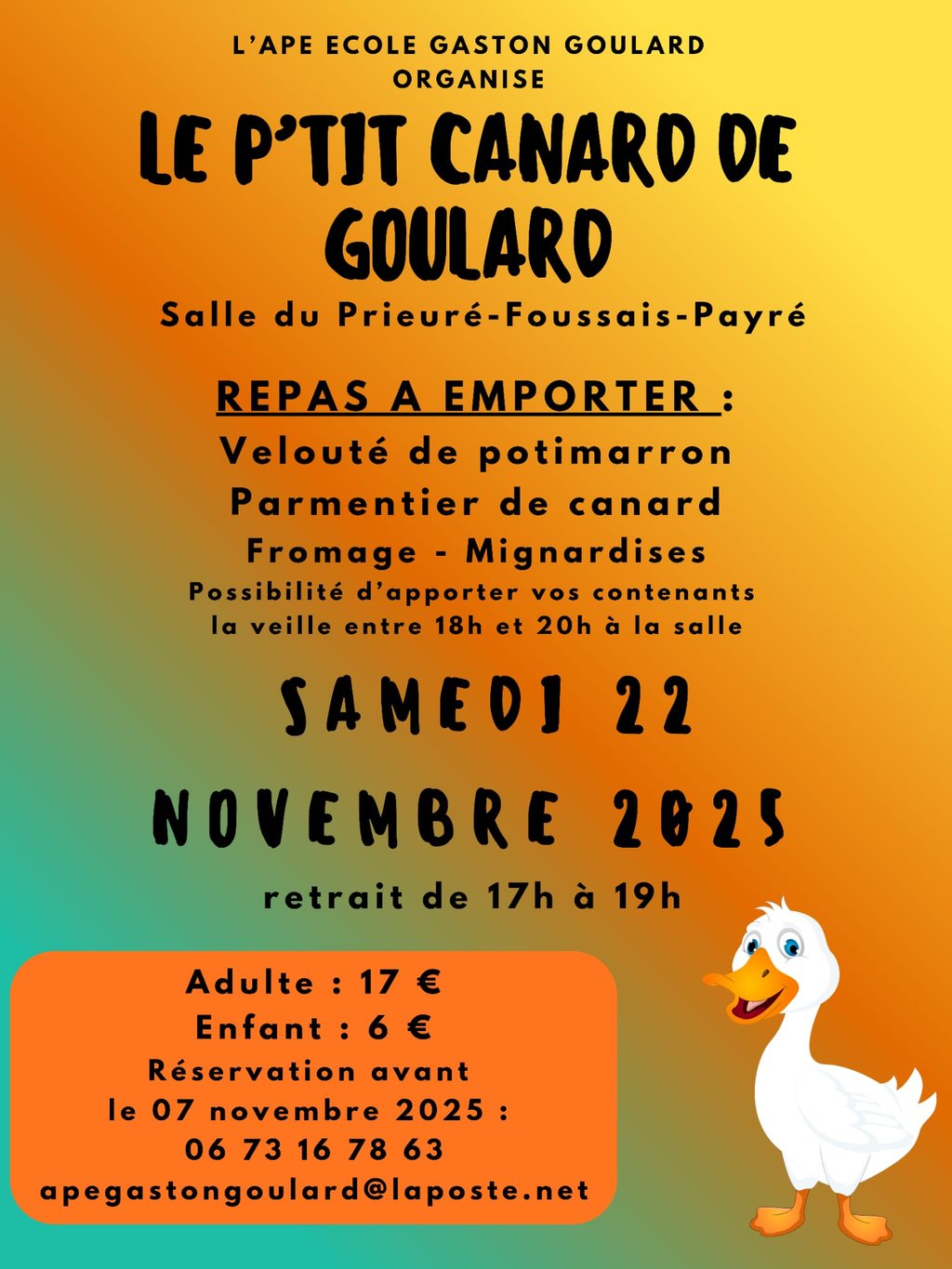 L'Association de Parents d'Eleves de l'école Gaston Goulard renouvelle son repas "Le p'tit canard de Goulard " le samedi 22 novembre 2025 uniquement à emporter.